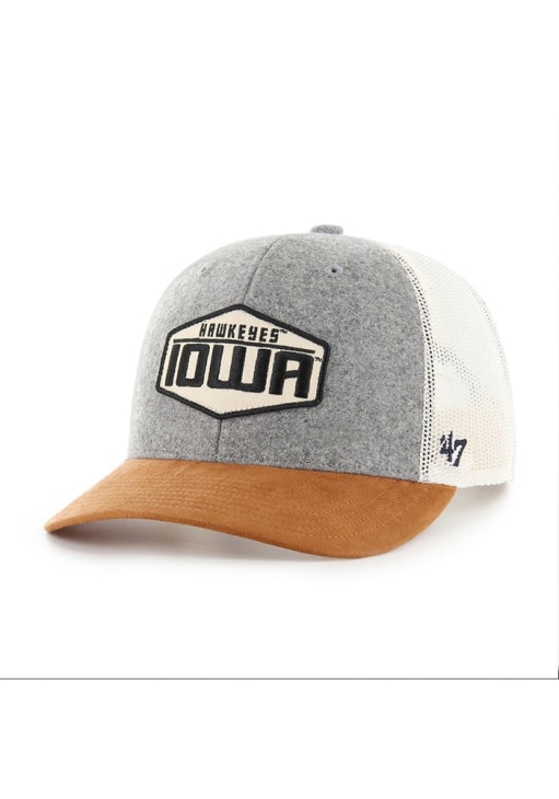 Product Details Product Details 47 Drover TruckerFront team wordmark hexagon patch2 Tone visor and crownContrast meshbackSnap ClosureCOTTON/POLY BLENDCurved BillLow CrownLightly StructuredWipe clean with cloth or cleaning kitImported Officially Licensed This Grey Hawkeyes Adjustable Hat features a team logo on front.