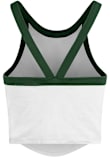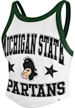 Elevate your tailgating style with this Michigan State Spartans Womens Tank Top. Stay fashionable and comfortable in the refreshing White Energize Sleeveless Shirt. Discover the enticing details of this MSU Tank Top, showcasing a screen vintage print team logo and team name with silver glitter on center chest that's sure to impress.