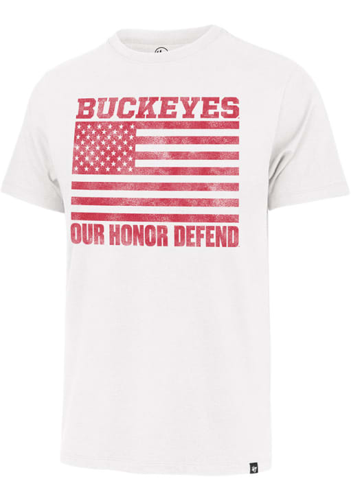 Support your Ohio State Buckeyes in this White Short Sleeve Fashion Tee! This Franklin Our Honor Defend Fashion T Shirt features a screen print team and event graphic on front chest. Be ready to yell "Go Buckeyes" when you wear this The Ohio State University Short Sleeve Fashion T Shirt in your favorite stadium or on the street.