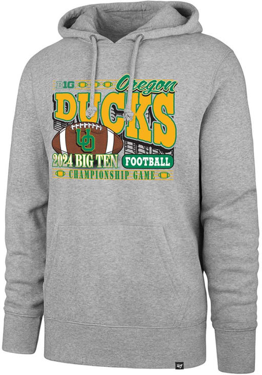 Make a bold statement in this Oregon Ducks Ash 2024 Big Ten Football Championship Headline Football Long Sleeve Fashion Hood! This Oregon Long Sleeve Fashion Hood features a screen print team and event graphic across chest. Go Ducks!