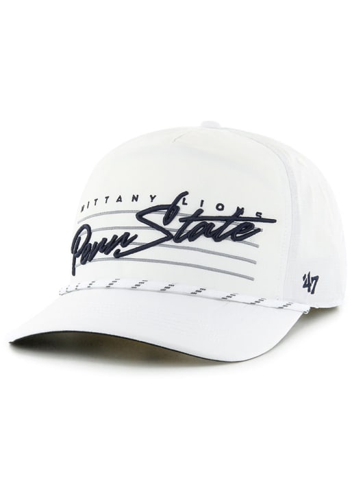 Product Details Product Details 47 Downburst HitchFront team wordmark script with stripingmulti-color ropeSide 47 LogoSnap ClosurePOLYESTERCurved BillLow CrownStructuredWipe clean with cloth or cleaning kitImported Officially Licensed This White Nittany Lions Adjustable Hat features a front embroidered cursive wordmark with rope across visor and back snap closure.