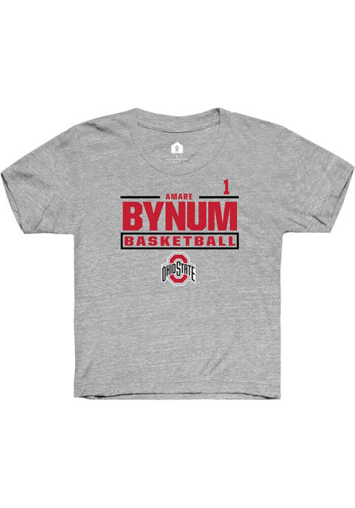 Kids, support your favorite player in this Youth Grey Ohio State Buckeyes Amare Bynum Short Sleeve Player Tee! This Player T-Shirt features a NIL graphic, so Amare Bynum can feel your team spirit! This is a perfect Youth Player T-Shirt to wear either everyday or on game day. Go Buckeyes!