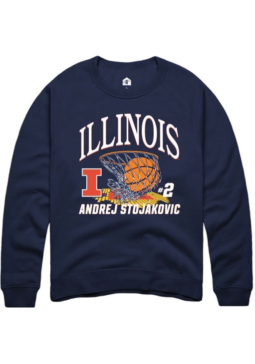 Support your Illinois Fighting Illini and favorite Andrej Stojakovic in this Illinois Fighting Illini Mens Navy Blue NIL Name Number Net Player Crew. This Crew Sweatshirt features a NIL graphic, and is sure to stand out in the stadium. Perfect to wear on game day or any day!