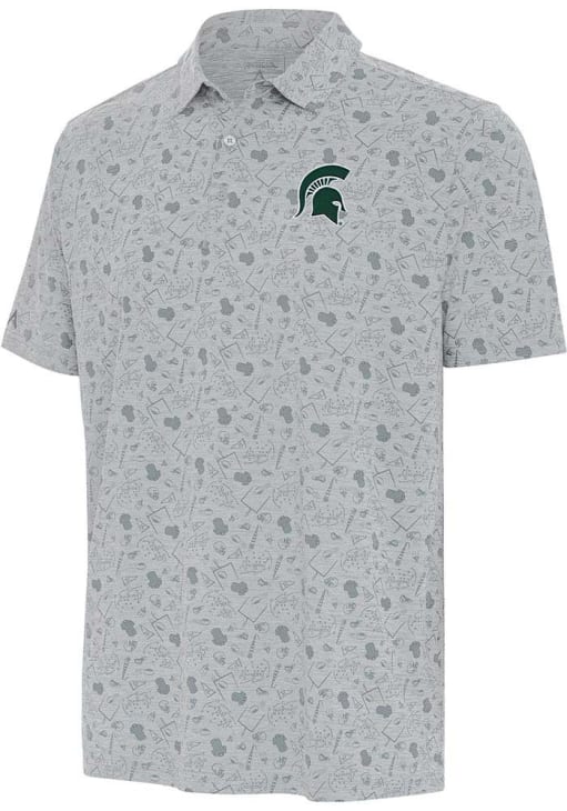 Enhance your professional style with this striking Mens Grey Short Sleeve Polo Shirt! Showcase your team pride among colleagues with this exceptional MSU Grey Football Relentless Short Sleeve Polo. Stand out and make a statement in this Michigan State Spartans Short Sleeve Polo, featuring a sublimated print with football tossed conversational pattern that adds a touch of distinction to your look.