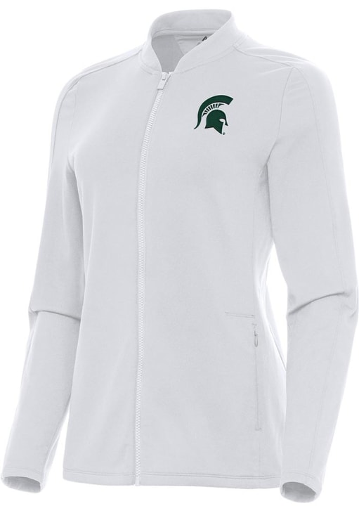 Stay warm and cozy with this Michigan State Spartans Womens White Continual Light Weight Jacket! Cheer on the Spartans in this MSU Light Weight Jacket. With a sleek lines and a blade collar, you won't want to be caught without this Light Weight Jacket on gameday.