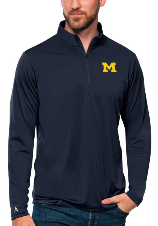 Embrace the warmth and showcase your Wolverines pride with our Michigan Wolverines Long Sleeve Qtr Zip Pullover. This Mens Blue Tribute Long Sleeve Pullover offers a team logo embroidered on left chest for the perfect combination of comfort and style. Elevate your everyday look with this must-have Michigan Wolverines Long Sleeve Qtr Zip Pullover.