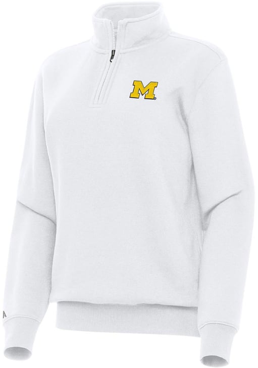 Embrace the warmth and showcase your Wolverines pride with our Michigan Wolverines Long Sleeve Qtr Zip. This Womens White Victory Long Sleeve Pullover offers a heavyweight cotton polyester brushed back fleece for the perfect combination of comfort and style. Elevate your everyday look with this must-have Michigan Wolverines Long Sleeve Qtr Zip.