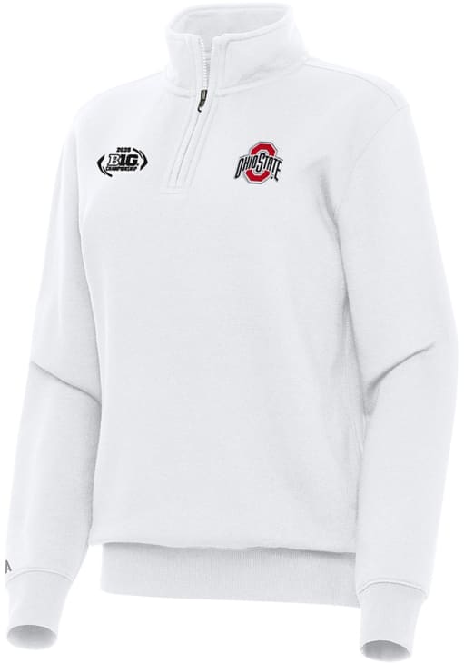 Embrace the warmth and showcase your Buckeyes pride with our Ohio State Buckeyes Long Sleeve Qtr Zip. This Womens White 2025 Big Ten Football Championship Long Sleeve Pullover offers a heavyweight cotton polyester brushed back fleece for the perfect combination of comfort and style. Elevate your everyday look with this must-have Ohio State Buckeyes Long Sleeve Qtr Zip.