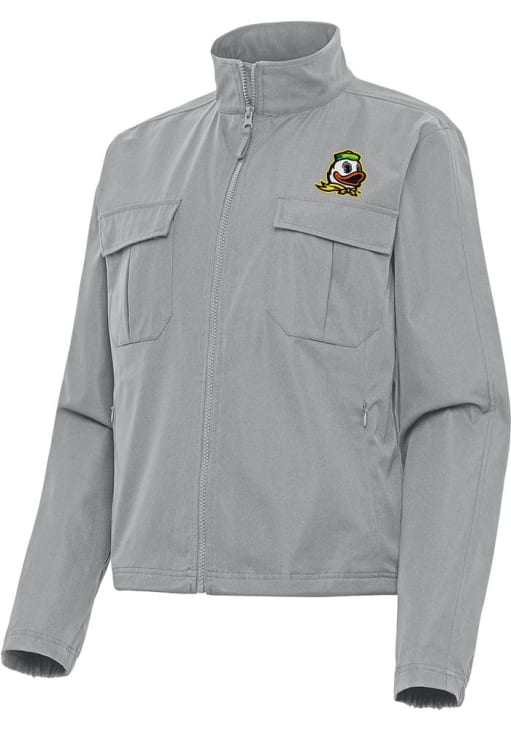 Stay warm and cozy with this Oregon Ducks Womens Grey Even Par Light Weight Jacket! Cheer on the Ducks in this Oregon Light Weight Jacket. With a double layer collar and flat patch chest pockets, you won't want to be caught without this Light Weight Jacket on gameday.