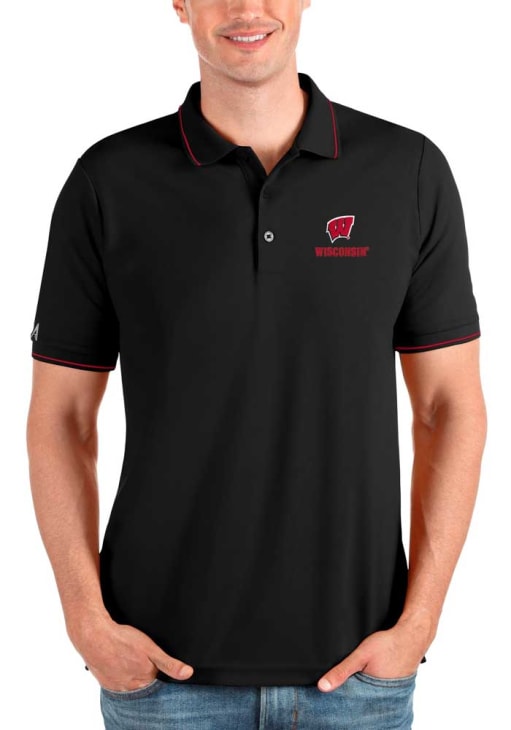 Enhance your professional style with this striking Mens Black Short Sleeve Polo Shirt! Showcase your team pride among colleagues with this exceptional Wisconsin Black Affluent Short Sleeve Polo. Stand out and make a statement in this Wisconsin Badgers Short Sleeve Polo, featuring a tipped flat knit collar and cuffs that adds a touch of distinction to your look.