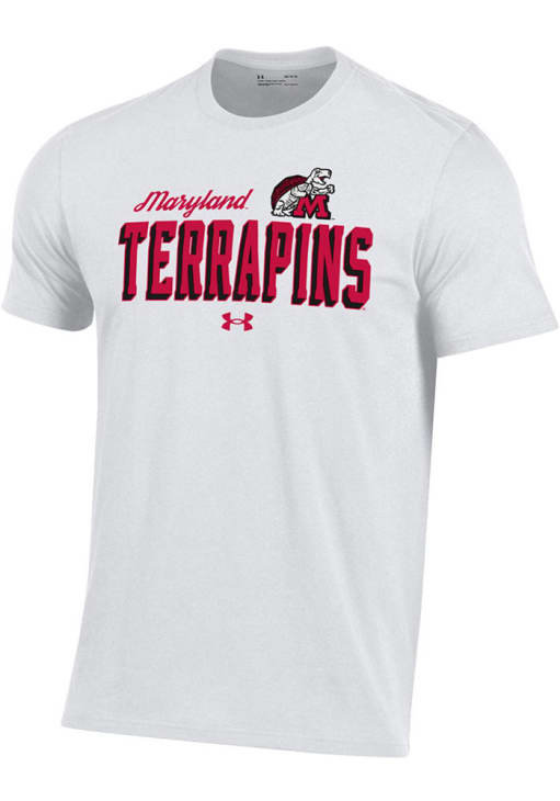 Display your team spirit with this remarkable Maryland Terrapins White Logo over Mascot Name Perf Cotton Short Sleeve T Shirt! The Maryland Short Sleeve Tee showcases a team name and mascot screenprinted on front chest that truly sets it apart. Stand out from the crowd and proudly declare your allegiance to the Terrapins with this exceptional White Maryland T Shirt. Go Terps!