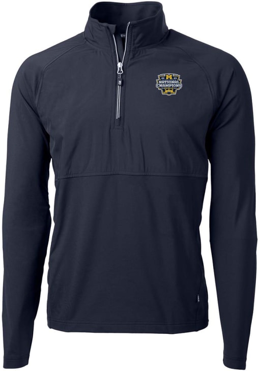 Embrace the warmth and showcase your Wolverines pride with our Michigan Wolverines Long Sleeve Qtr Zip Pullover. This Mens Blue 2023 College Football National Champions Adapt Eco Hybrid Long Sleeve Pullover offers a wind resistant recycled shell for the perfect combination of comfort and style. Elevate your everyday look with this must-have Michigan Wolverines Long Sleeve Qtr Zip Pullover.