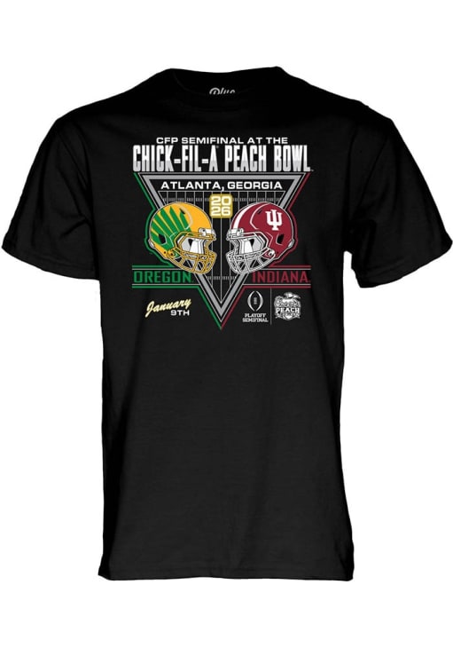 Display your team spirit with this remarkable Indiana Hoosiers Blue 84 Black 2026 Peach Bowl vs. Oregon Ducks Short Sleeve T Shirt! The Indiana Short Sleeve Tee showcases a screen print of team graphic on front chest that truly sets it apart. Stand out from the crowd and proudly declare your allegiance to the Hoosiers with this exceptional Black Indiana T Shirt. Indiana, Our Indiana!