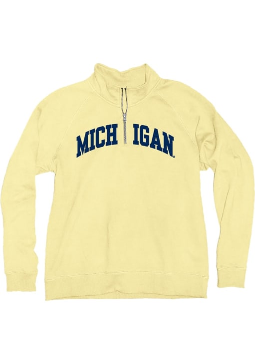 Embrace the warmth and showcase your Wolverines pride with our Michigan Wolverines Long Sleeve Qtr Zip. This Womens Yellow Sanded Fleece Long Sleeve Pullover offers a applique team name on center chest for the perfect combination of comfort and style. Elevate your everyday look with this must-have Michigan Wolverines Long Sleeve Qtr Zip.