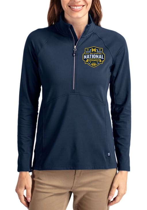 Embrace your Wolverines spirit with pride in this Michigan Wolverines Long Sleeve Qtr Zip. This Womens Navy Blue 2026 MBB Champions Adapt Eco Long Sleeve Pullover showcases a embroidered team logo at left chest. You'll want to wear this Michigan Wolverines Long Sleeve Qtr Zip every day.