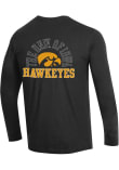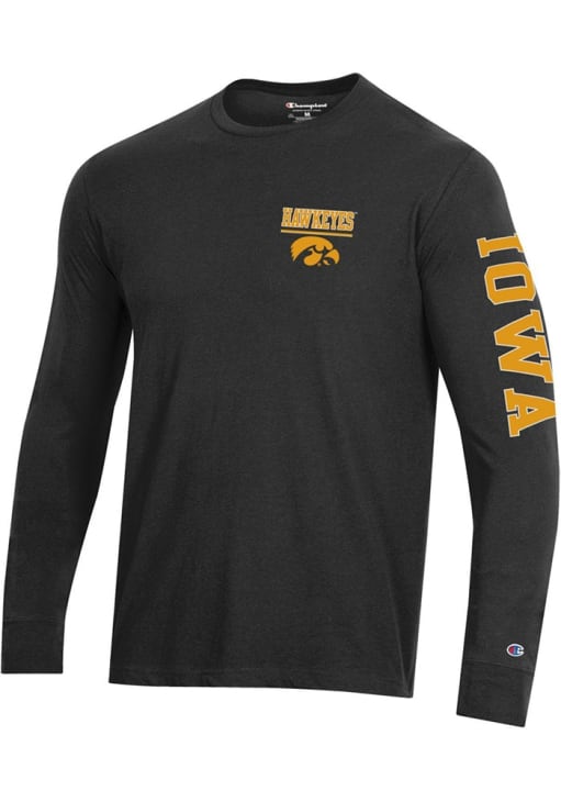 Show your Iowa Hawkeyes spirit in this Hawkeyes Black T Shirt! This Hawkeyes Stadium Three Hit Design Long Sleeve T Shirt makes a great layer for cooler nights cheering on the Hawkeyes. Featuring a screen print team logo on front left chest, left sleeve and back, this Iowa Hawkeyes Long Sleeve Tee is an essential addition for every fan. Go Hawkeyes!