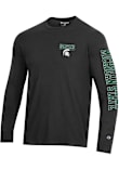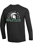 Show your Michigan State Spartans spirit in this MSU Black T Shirt! This MSU Stadium Three Hit Design Long Sleeve T Shirt makes a great layer for cooler nights cheering on the Spartans. Featuring a screen print team logo on front left chest, left sleeve and back, this Michigan State Spartans Long Sleeve Tee is an essential addition for every fan. Go Spartans!