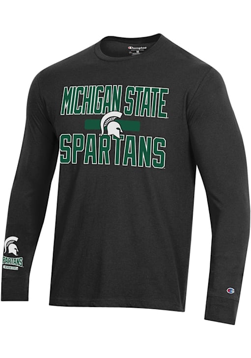 Show your Michigan State Spartans spirit in this MSU Black T Shirt! This MSU Stadium Three Hit Long Sleeve T Shirt makes a great layer for cooler nights cheering on the Spartans. Featuring a screen print team logo on front chest, right sleeve and back, this Michigan State Spartans Long Sleeve Tee is an essential addition for every fan. Go Spartans!