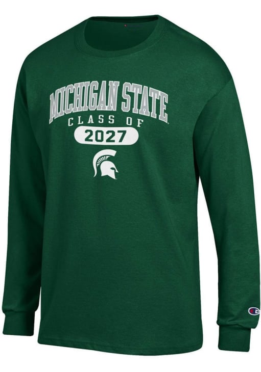 Show your Michigan State Spartans spirit in this MSU Green T Shirt! This MSU Class of 2027 Jersey Long Sleeve T Shirt makes a great layer for cooler nights cheering on the Spartans. Featuring a printed team graphic on front chest, this Michigan State Spartans Long Sleeve Tee is an essential addition for every fan. Go Spartans!
