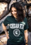 Display your team spirit with this remarkable Michigan State Spartans Green Seal Short Sleeve T Shirt! The MSU Short Sleeve Tee showcases a screen print of school name with seal graphic beneath that truly sets it apart. Stand out from the crowd and proudly declare your allegiance to the Spartans with this exceptional Green MSU T Shirt. Go Spartans!