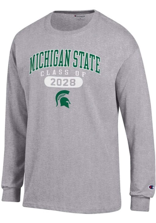 Show your Michigan State Spartans spirit in this MSU Grey T Shirt! This MSU Class of 2028 Jersey Long Sleeve T Shirt makes a great layer for cooler nights cheering on the Spartans. Featuring a printed team graphic on front chest, this Michigan State Spartans Long Sleeve Tee is an essential addition for every fan. Go Spartans!