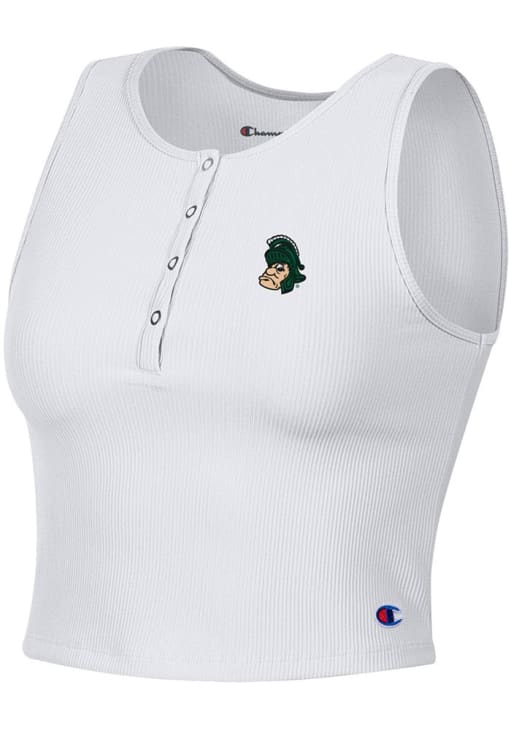 Elevate your tailgating style with this Michigan State Spartans Womens Tank Top. Stay fashionable and comfortable in the refreshing White Ottoman Henley Sleeveless Shirt. Discover the enticing details of this MSU Tank Top, showcasing a screenprint team logo on left chest that's sure to impress.