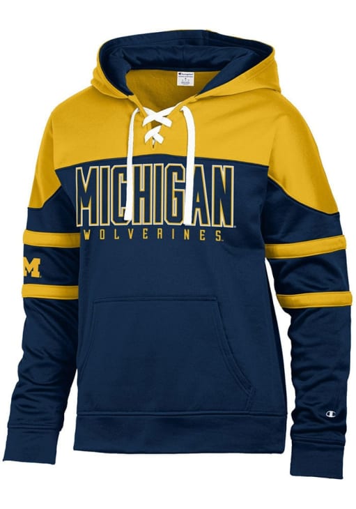 Make a bold statement in this Michigan Wolverines Blue Stadium Hockey Laceup Long Sleeve Hood! This Michigan Long Sleeve Hoodie features a screen print at center chest and right sleeve. Go Michigan!