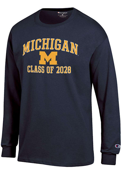 Show your Michigan Wolverines spirit in this Michigan Navy Blue T Shirt! This Michigan Font Class of 2028 Jersey Long Sleeve T Shirt makes a great layer for cooler nights cheering on the Wolverines. Featuring a screen print team graphic on front chest, this Michigan Wolverines Long Sleeve Tee is an essential addition for every fan. Go Michigan!