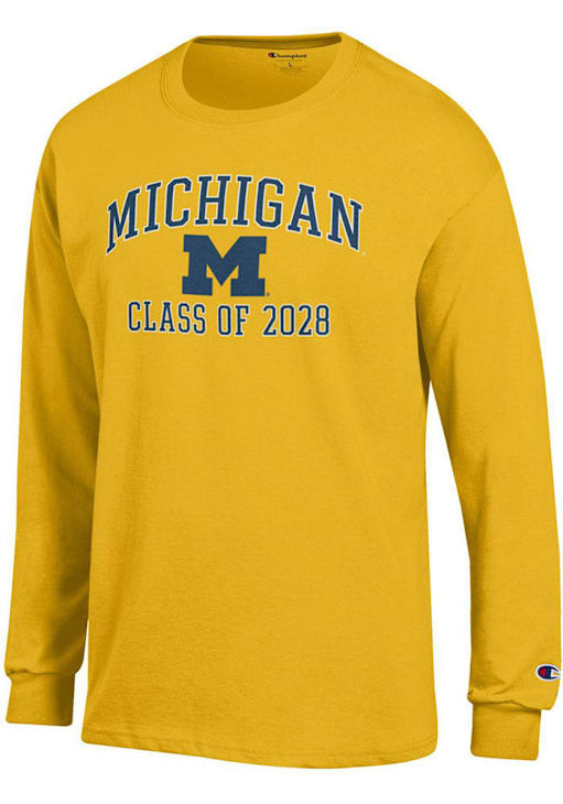 Show your Michigan Wolverines spirit in this Michigan Yellow T Shirt! This Michigan Font Class of 2028 Jersey Long Sleeve T Shirt makes a great layer for cooler nights cheering on the Wolverines. Featuring a screen print team graphic on front chest, this Michigan Wolverines Long Sleeve Tee is an essential addition for every fan. Go Michigan!