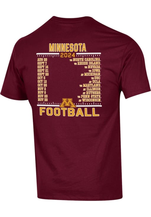 Display your team spirit with this remarkable Minnesota Golden Gophers Champion Maroon 2024 Football Schedule Short Sleeve T Shirt! The Minnesota Short Sleeve Tee showcases a screenprint of team name and logo across chest and football schedule on back that truly sets it apart. Stand out from the crowd and proudly declare your allegiance to the Golden Gophers with this exceptional Maroon Minnesota T Shirt. Fight, Gophers!