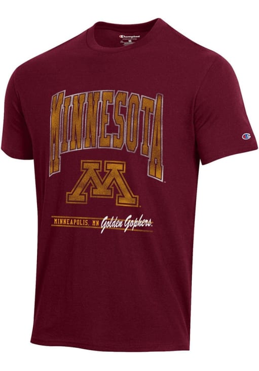 Display your team spirit with this remarkable Minnesota Golden Gophers Champion Maroon Stadium Embroidery Short Sleeve T Shirt! The Minnesota Short Sleeve Tee showcases a distressed screen print with embroidery at center chest that truly sets it apart. Stand out from the crowd and proudly declare your allegiance to the Golden Gophers with this exceptional Maroon Minnesota T Shirt. Fight, Gophers!