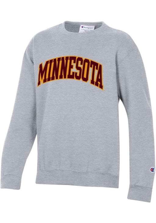 Your little one will look great at school in the Champion Youth Grey Minnesota Golden Gophers ARCH WORDMARK Crew Sweatshirt! The Golden Gophers Long Sleeve Crew Sweatshirt features a screenprint team graphic. It will be sure to keep future Golden Gophers fans cozy and warm as they head to school or to watch their favorite team play!