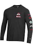 Show your Ohio State Buckeyes spirit in this The Ohio State University Black T Shirt! This The Ohio State University Stadium Three Hits Long Sleeve T Shirt makes a great layer for cooler nights cheering on the Buckeyes. Featuring a screen print team graphic on front left chest, left sleeve and back, this Ohio State Buckeyes Long Sleeve Tee is an essential addition for every fan. Go Buckeyes!