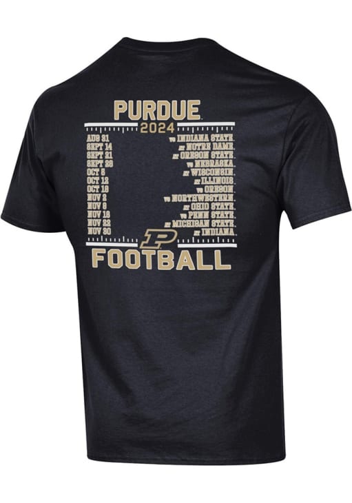 Display your team spirit with this remarkable Purdue Boilermakers Champion Black 2024 Football Schedule Short Sleeve T Shirt! The Purdue Short Sleeve Tee showcases a screenprint of team name and logo across chest and football schedule on back that truly sets it apart. Stand out from the crowd and proudly declare your allegiance to the Boilermakers with this exceptional Black Purdue T Shirt. Hail Purdue!