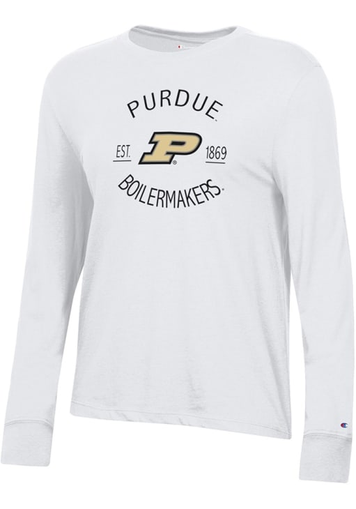 Show your Purdue Boilermakers spirit in this Purdue White T-Shirt! This Purdue Core Long Sleeve T-Shirt makes a great layer for cooler nights cheering on the Boilermakers. Featuring a printed team graphic on full chest, this Purdue Boilermakers Long Sleeve LS Tee is an essential addition for every fan. Hail Purdue!