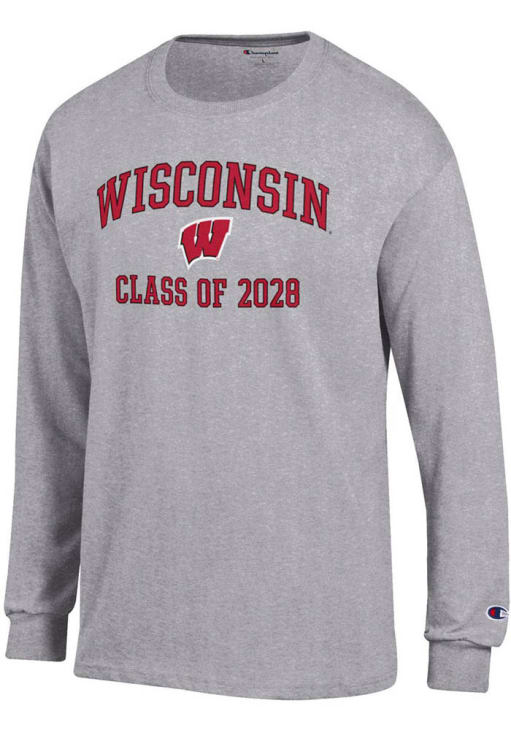 Show your Wisconsin Badgers spirit in this Wisconsin Grey T Shirt! This Wisconsin Font Class of 2028 Jersey Long Sleeve T Shirt makes a great layer for cooler nights cheering on the Badgers. Featuring a printed team graphic on front chest, this Wisconsin Badgers Long Sleeve Tee is an essential addition for every fan. Go Badgers!