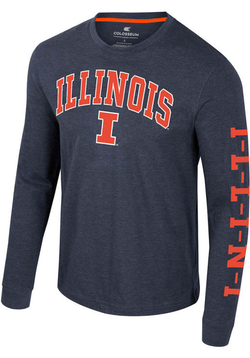 Show your Illinois Fighting Illini spirit in this Illinois Navy Blue T Shirt! This Illinois Reese Long Sleeve T Shirt makes a great layer for cooler nights cheering on the Fighting Illini. Featuring a rubberized print of arched team name over mascot on front chest with team slogan on left sleeve, this Illinois Fighting Illini Long Sleeve Tee is an essential addition for every fan. Go, Illini, Go!