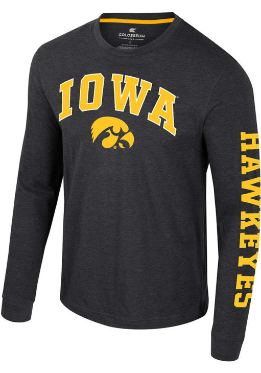 Show your Iowa Hawkeyes spirit in this Hawkeyes Black T Shirt! This Hawkeyes Reese Long Sleeve T Shirt makes a great layer for cooler nights cheering on the Hawkeyes. Featuring a rubberized print of arched team name over mascot on front chest with team slogan on left sleeve, this Iowa Hawkeyes Long Sleeve Tee is an essential addition for every fan. Go Hawkeyes!