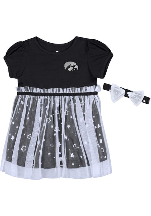 Product Details Product Details Comes with a headband with a white tulle bowGathered sleevesWhite tulle overlay skirt with paperbag waistSilver foil star print on skirtTeam color elastic waistbandPerfect for any young sports fan!100% COTTONImport, Domestic Officially Licensed Let your unique style show in this Iowa Hawkeyes Toddler Girls Dress. Featuring a screenprint team graphic, this Black Hawkeyes Dress is the perfect way to show off your style and pride for the Iowa Hawkeyes.