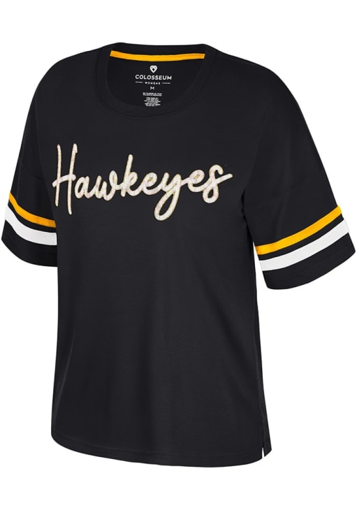 Display your team spirit with this remarkable Iowa Hawkeyes Black Realist Short Sleeve T-Shirt! The Hawkeyes Short Sleeve Tee showcases a sequin with glitter team name on center chest that truly sets it apart. Stand out from the crowd and proudly declare your allegiance to the Hawkeyes with this exceptional Black Hawkeyes T-Shirt. Go Hawkeyes!
