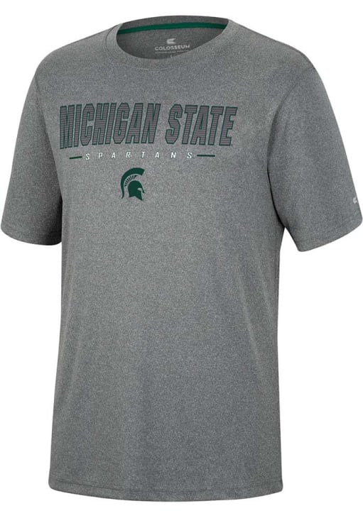 Stay cool and display your Michigan State Spartans spirit in this Charcoal High Pressure T Shirt. This Short Sleeve is the perfect Tee for working out, heading to class, or cheering on the Spartans. Showcasing a rubberized screen print team name and logo on front chest, there's no mistaking your Michigan State Spartans pride in this Spartans High Pressure T Shirt!