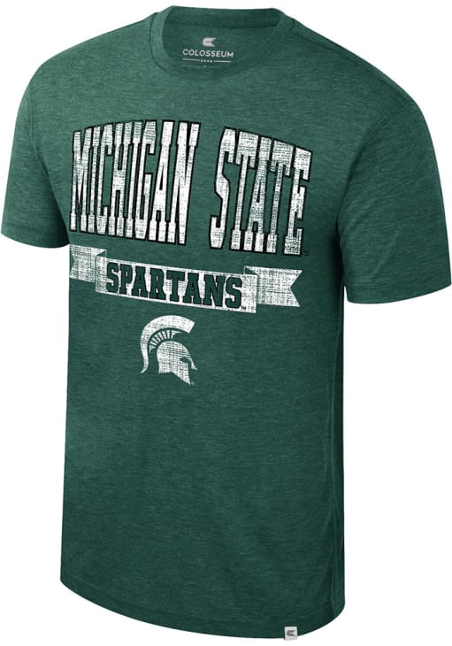 Support your Michigan State Spartans in this Green Short Sleeve Fashion Tee! This Business Arrangement Fashion T Shirt features a distressed softhand screenprint school name, team name banner and primary logo across front. Be ready to yell "Go Spartans" when you wear this MSU Short Sleeve Fashion T Shirt in your favorite stadium or on the street.