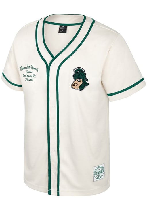 There will be no mistaking your MSU support when you wear this Michigan State Spartans Mens White Vintage Logo Jersey! Look great and stand out from the crowd in this Michigan State Spartans Baseball Jersey, which features a emboridered team logos on chest, patch on front bottom left, and screeenprinted team name across back.