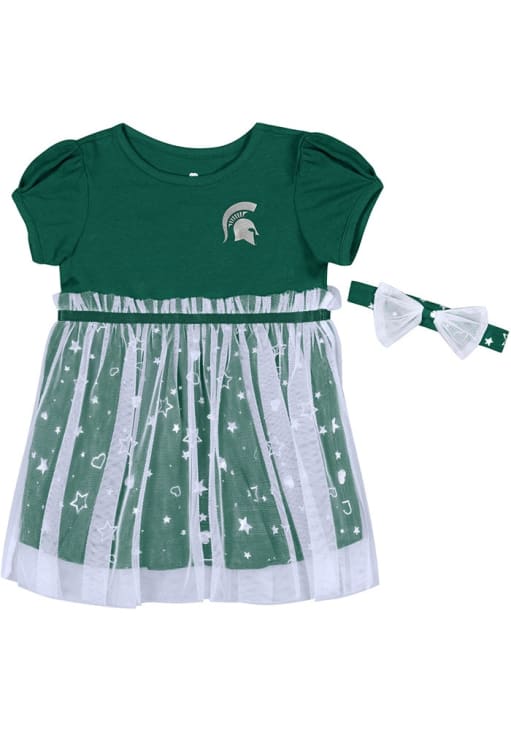 Product Details Product Details Comes with a headband with a white tulle bowGathered sleevesWhite tulle overlay skirt with paperbag waistSilver foil star print on skirtTeam color elastic waistbandPerfect for any young sports fan!100% COTTONImport, Domestic Officially Licensed Let your unique style show in this Michigan State Spartans Toddler Girls Dress. Featuring a screenprint team graphic, this Green Spartans Dress is the perfect way to show off your style and pride for the Michigan State Spartans.