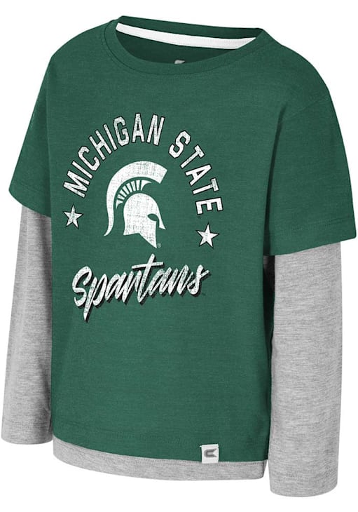 Product Details Product Details Second color neck tapeDistressed washed out printPoly/ cotton blendHeather grey long sleeve w/ team color overlayPerfect for any young sports fan!52% COTTON / 48% POLYESTERImport, Domestic Officially Licensed Style your little Spartans fan in this Green Michigan State Spartans Long Sleeve T-Shirt. This Investigatory T-Shirt features a distressed screen print.