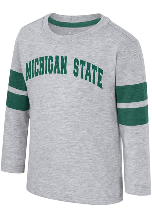 Product Details Product Details Contrast neck tapingWaterbased print sleeve stripesWaterbased print team graphics on chestFit: True to SizeCOTTON/POLY BLENDMachine WashableImported Officially Licensed Style your little Spartans fan in this Grey Michigan State Spartans Long Sleeve T-Shirt. This Dewy T-Shirt features a screen print team graphic.