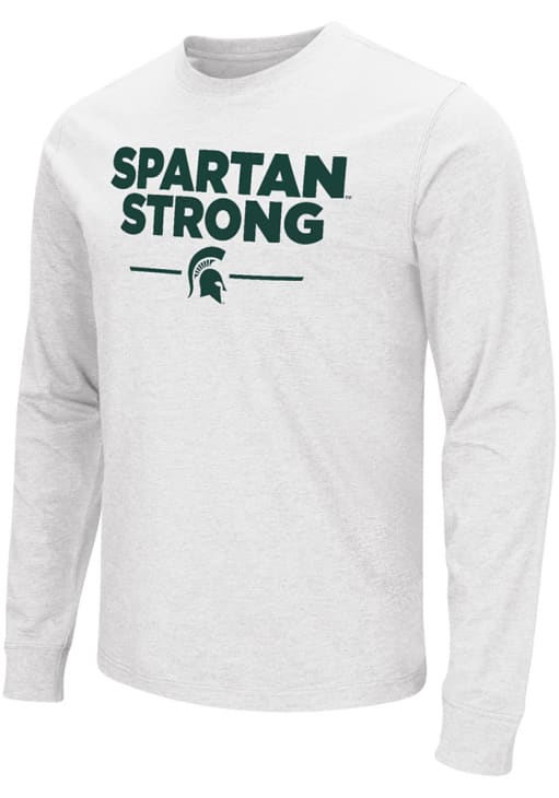 Show your Michigan State Spartans spirit in this MSU White T Shirt! This MSU Spartan Strong Long Sleeve T Shirt makes a great layer for cooler nights cheering on the Spartans. Featuring a screen print of Spartan Strong graphic on front chest, this Michigan State Spartans Long Sleeve Tee is an essential addition for every fan. Go Spartans!