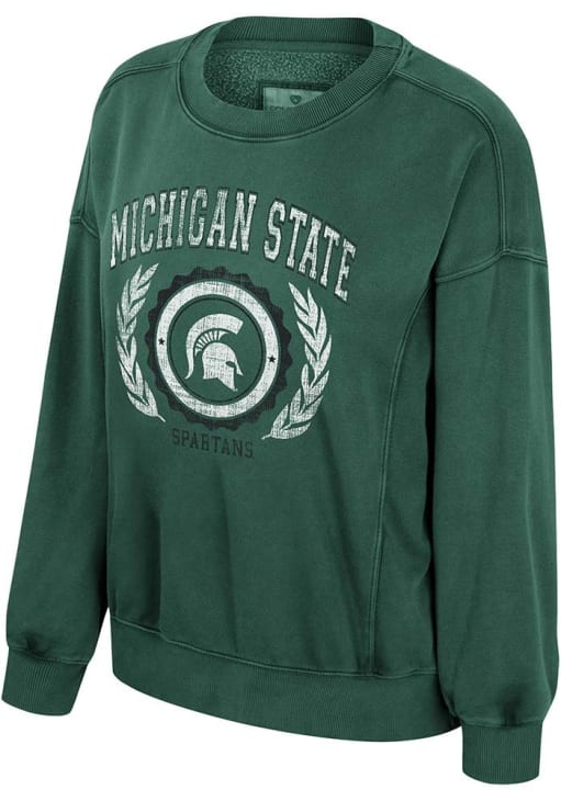 Gear up for the ultimate game day experience with this remarkable Michigan State SpartansWomens Green Girls Night Crew Sweatshirt! Designed with the true fan in mind, this Spartans Long Sleeve Sweatshirt features a distressed waterbased print team name, school, and logo on center front. Stay warm and comfortable with this Womens MSU Spartans Crew Sweatshirt.