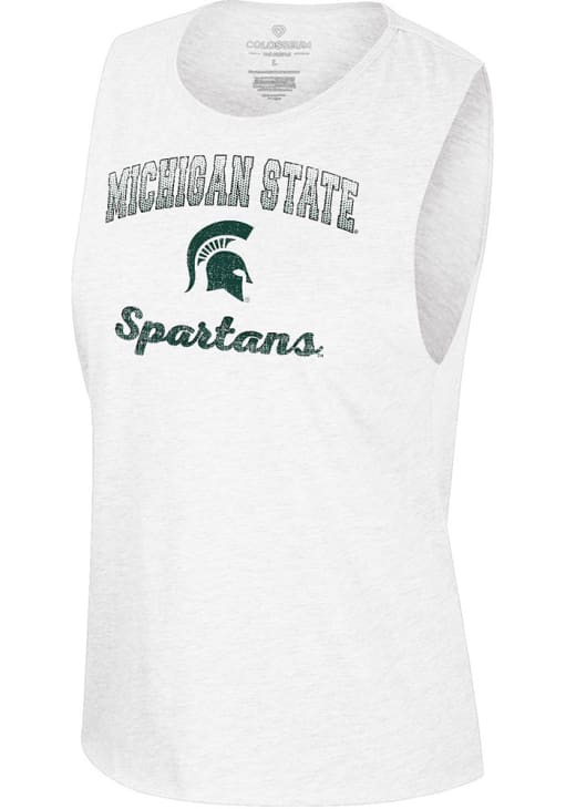 Elevate your tailgating style with this Michigan State Spartans Womens Tank Top. Stay fashionable and comfortable in the refreshing White Sustainable Sleeveless Shirt. Discover the enticing details of this MSU Tank Top, showcasing a screenprint team name and logo on center chest that's sure to impress.