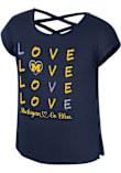 Show your support for Wolverines in this Girls Blue Michigan Wolverines Short Sleeve Fashion Tee! This Ember Fashion T-Shirt features a screenprint team graphic with rhinestones that pairs perfect with any wardrobe. Get ready to show pride for your favorite team as you cheer "Go Michigan"